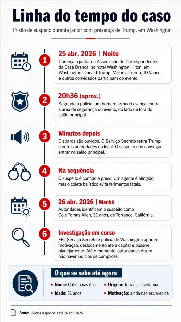 O ataque aconteceu durante o jantar anual da Associação de Correspondentes da Casa Branca, evento que reúne jornalistas, autoridades e convidados.