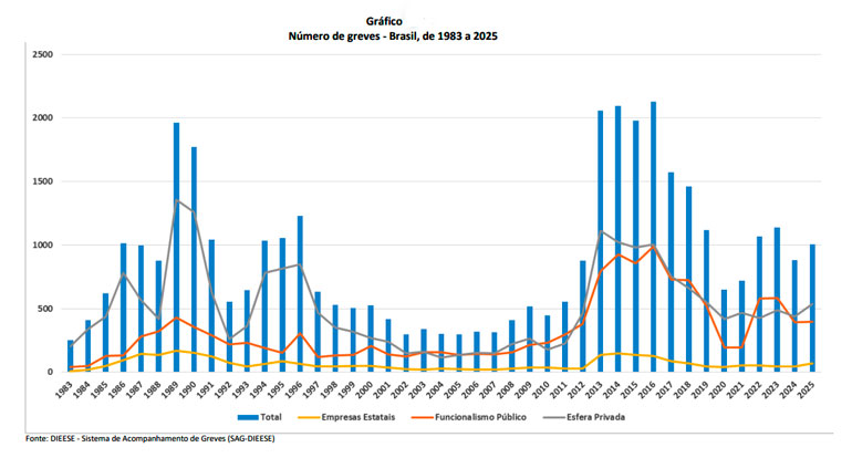 O Brasil registrou 1.006 greves em 2025, alta de 14% em relação ao ano anterior, segundo levantamento do Departamento Intersindical de Estatística e Estudos Socioeconômicos (DIEESE).
