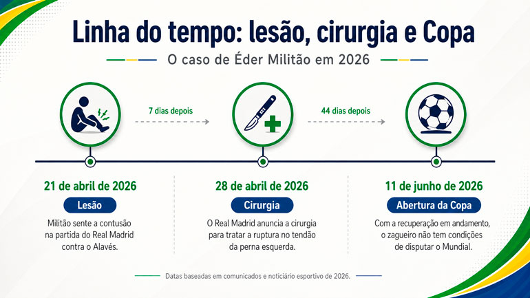 O zagueiro Éder Militão, do Real Madrid e da Seleção Brasileira, está fora da Copa do Mundo de 2026 após passar por cirurgia para tratar uma ruptura no tendão proximal do bíceps femoral da perna esquerda.