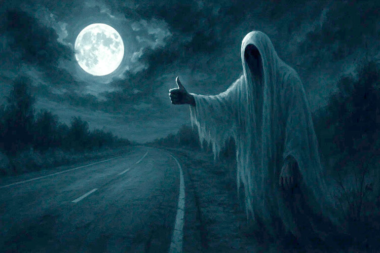 Dois anos depois ele passa pela mesma estrada, à noite, e vê um homem todo de preto pedindo uma carona. Para o carro, o cara entra e começam a conversar. Quando chegam na cidadezinha onde o carona vai saltar, o motorista se despede dele e, ao apertar sua mão, vê que lhe falta um dedo e pergunta: